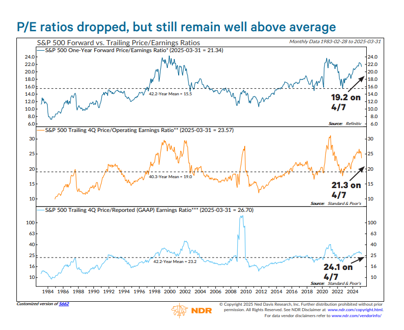 Despite a market correction around the Liberation Day selloff in early April, U.S. stocks remain far from cheap. Valuations, measured by price/earnings (P/E) ratios, have declined but remain well above long-term averages. Analysis from Ned Davis Research (NDR) shows that the S&P 500’s forward P/E ratios dropped 14% to 19.2%, yet that remains 3.7 points above its 40-year average. Trailing operating and GAAP P/E ratios fell about 20% but also remain elevated historically. The drop in forward P/E was cushioned by falling earnings estimates, especially for the first half of 2025.