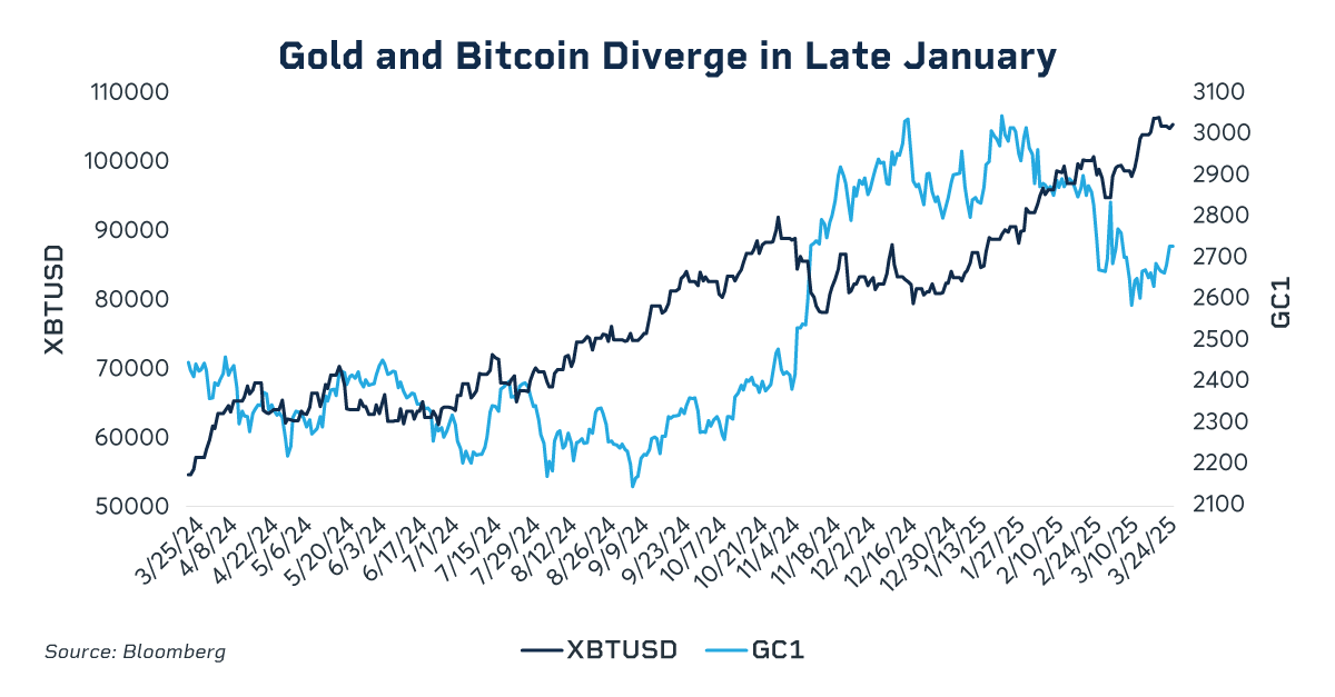 From November 2022 to November 2024, gold and bitcoin moved in a relatively tight correlation, with gold gaining 67% while the more volatile bitcoin surged nearly 400%. Analysts widely believed that the two assets would continue to move in tandem, given their shared status as hedges against weak global currency policies. However, this relationship began to fray in 2025. As of late March, gold has risen 16%, while bitcoin has fallen by more than 6%.