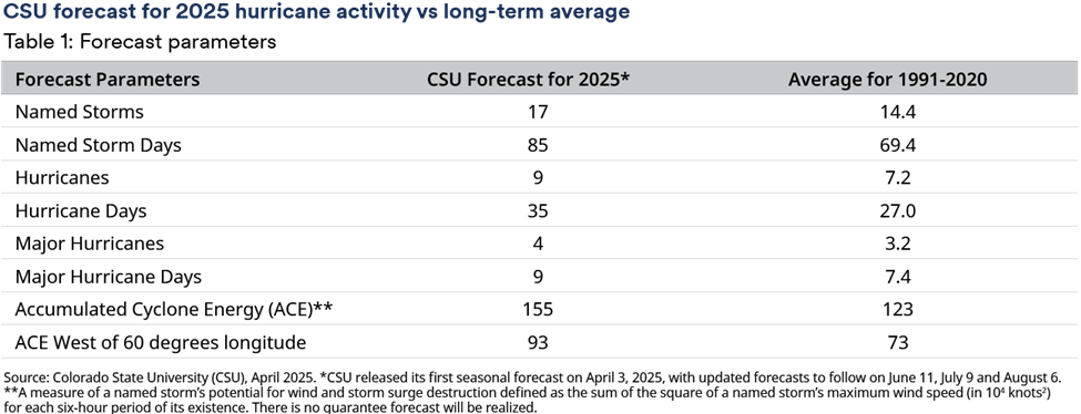 - Colorado State University's forecast for the 2025 Atlantic hurricane season predicts "above average" activity, with 17 named storms, including nine hurricanes, highlighting a peak risk period for insurance-linked securities (ILS) investments in regions along the Gulf and East Coasts.
