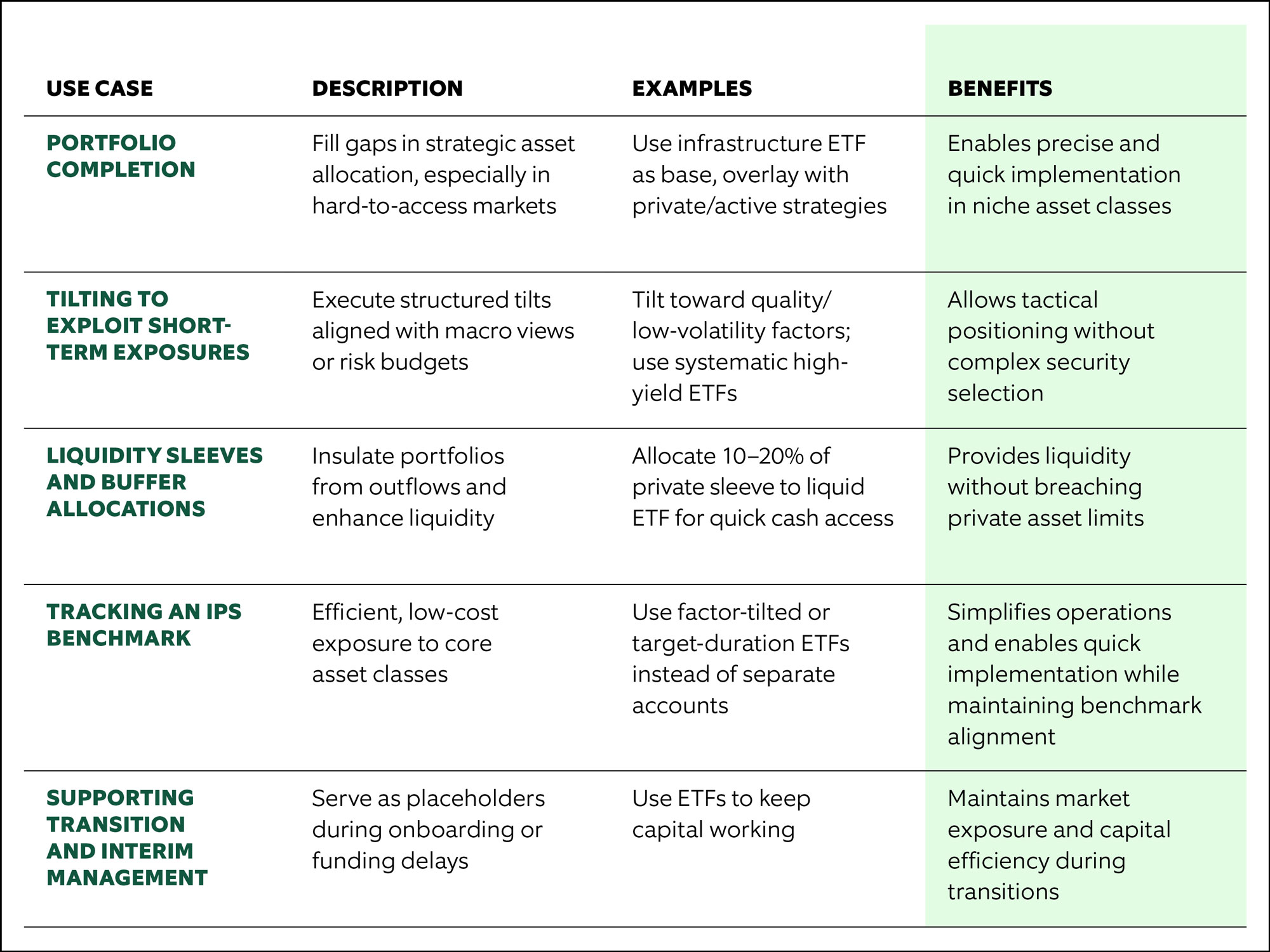 The current landscape of institutional ETF use reflects both innovative application and deliberate, long-term strategy. Here are five of the most prevalent ways institutions are using ETFs today: