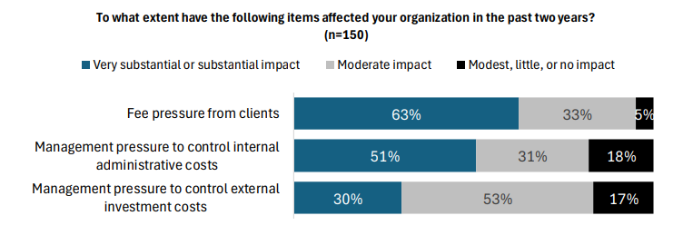Asset and wealth managers are under sustained pressure from clients to limit management fees, according to study participants. Fully 63% of respondents reported that fee pressure from clients has had a substantial impact on their organization in recent years.
