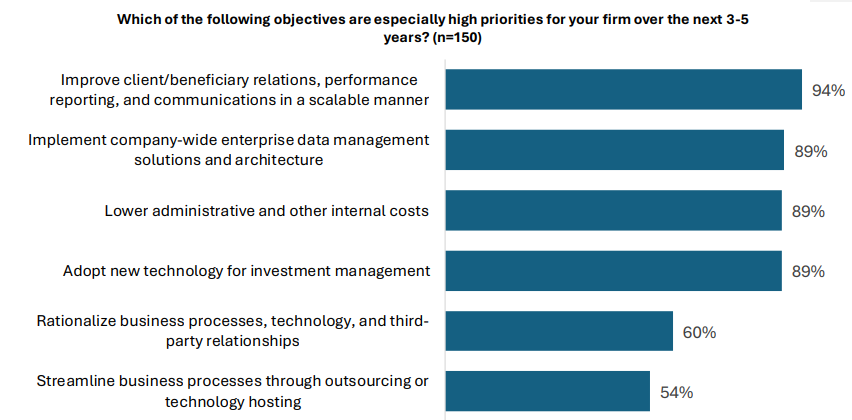 In response to topline pressure from clients and close cost oversight from firm management, a solid majority of survey respondents (94%) say they are poised to improve their relationships with clients by strengthening their performance reporting and client communication capabilities. Their efforts to do so are likely to call for investment in enterprise data management solutions and new technology for investment management, each of which are a high priority among 89% of study participants.