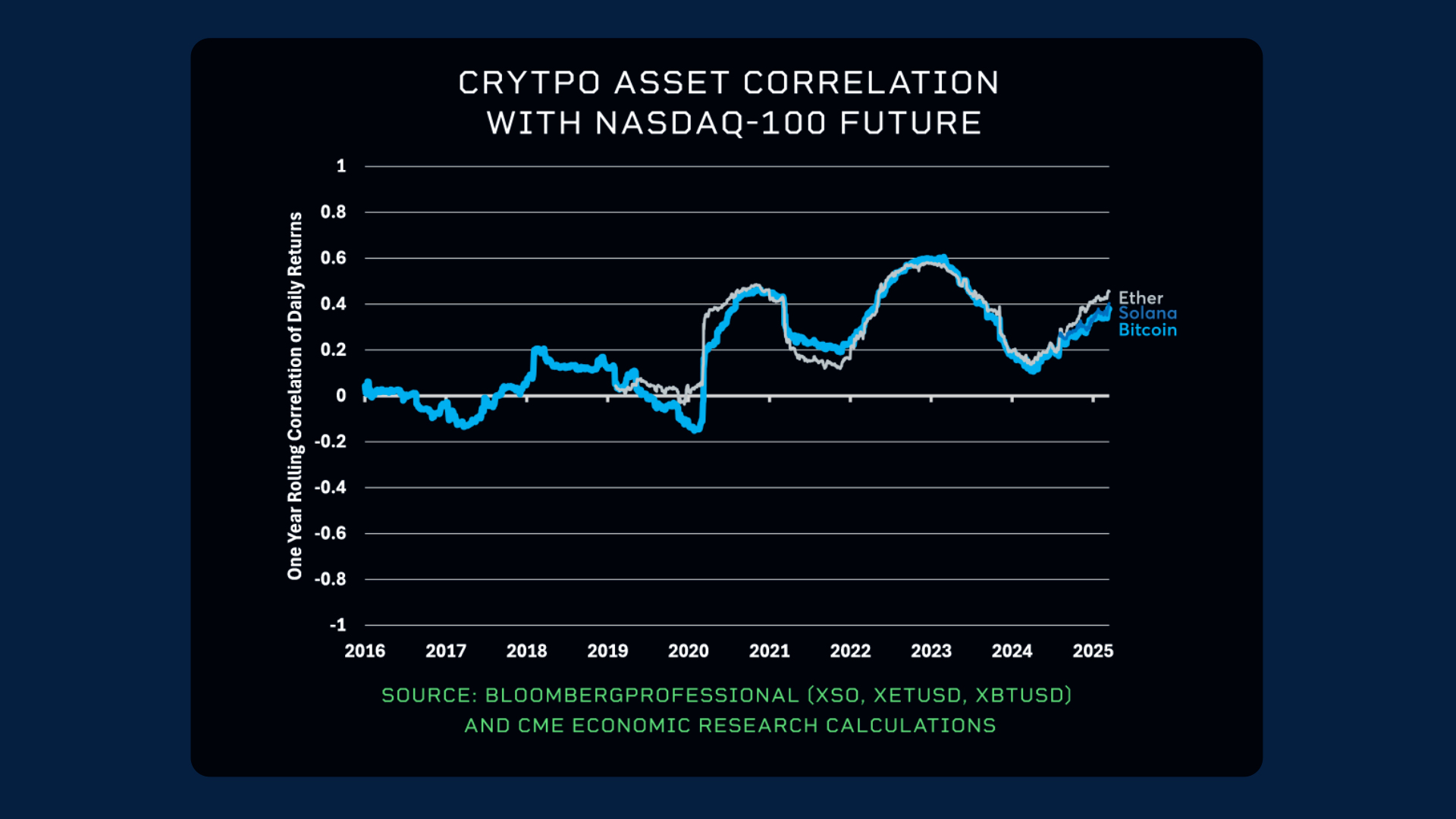 The one year rolling correlation of SOL is high with both ether and bitcoin at around +0.7. However, SOL is slightly less correlated to bitcoin and ether than they are to one another.