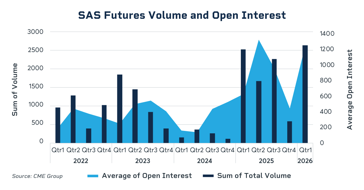 Trading activity in SAS ramped up in 2025, reaching record highs as the market sought additional tools for managing price risk amid uncertainty in the outlook for global trade flows, driven by tariff headlines. Open interest reached a record 1,961 contracts in March.