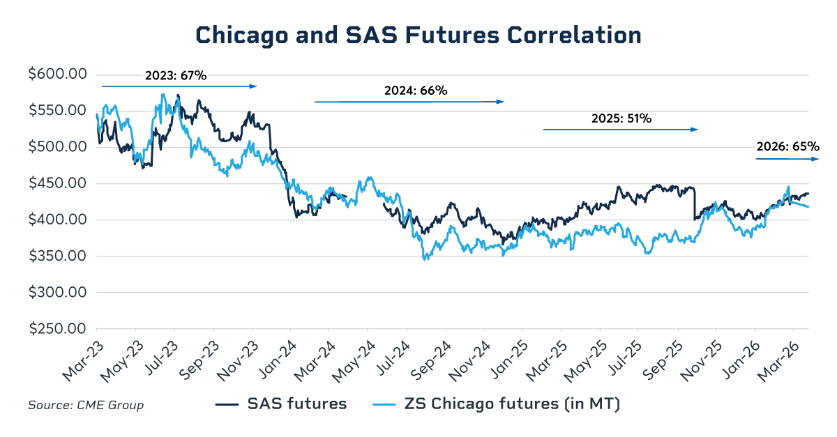 Demonstrating seasonality, the total correlation between the daily settlement prices for SAS and Soybean futures over the last 36 months is 77%, but when considering the data quarterly, individual coefficients of correlation are higher, ranging from 81% to 92%. While Q4 and Q1 show stronger correlations between the two futures, the weakest correlation is observed in the second quarter, when the first Brazilian harvest is marketed. North American soybeans, conversely, are harvested from September through November.