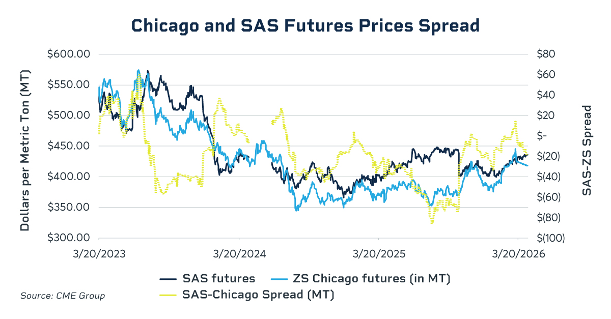 The Chicago-Brazil basis fluctuated wildly in 2025, with SAS under Chicago Soybeans by more than $80 per ton mid-year, and then exceeding Chicago Soybeans by year-end. Tracking the settlement prices of Chicago and SAS futures contracts (converted to the same unit) can provide valuable price discovery for this regional basis.