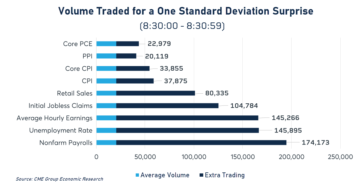 The 1-minute results were particularly striking. On days with no economic data releases or when data showed no surprises versus consensus, in the first minute after the report (8:30:00 - 8:30:59), on average about 20,663 interest rate futures contracts were traded. A one standard deviation surprise in NFP in either direction led to 174,173 additional contracts traded above average between 8:30:00 - 8:30:59.