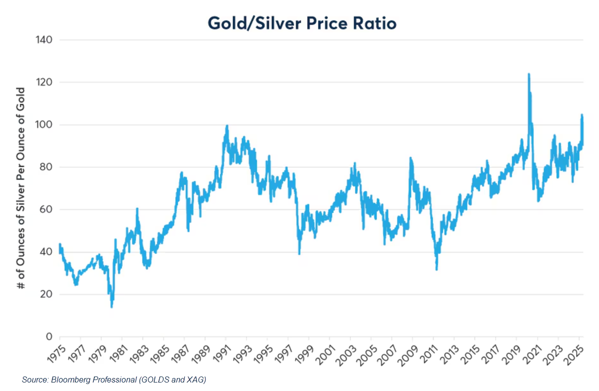 Silver and platinum are trading at significant discounts to gold, making them an attractive option for those seeking upside potential. The gold-to-silver ratio recently hit an 11-year high, underscoring silver’s relative undervaluation and the opportunity it could present for investors.