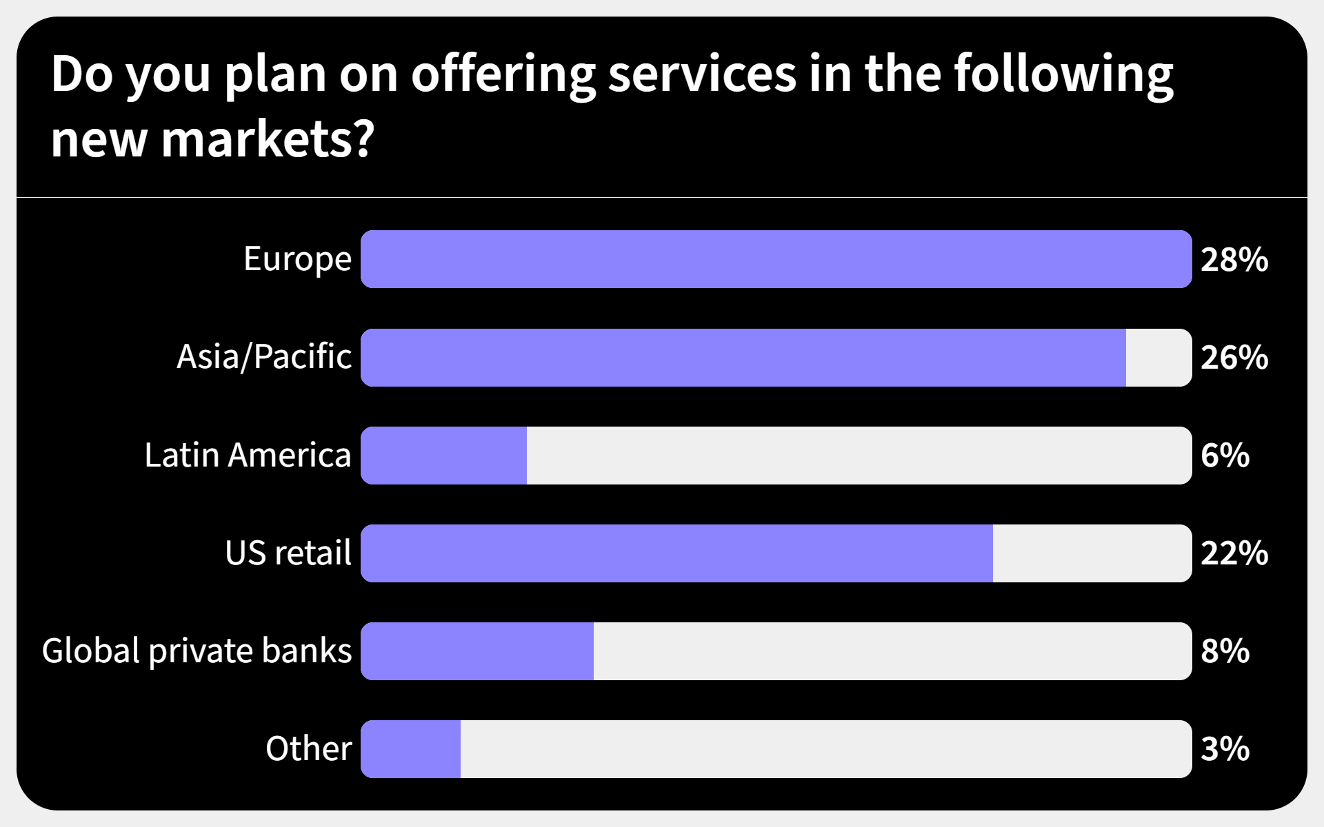 Polling during the event reveals where asset managers are looking to expand their services to. Europe leads with 28% of respondents targeting the region, followed closely by Asia/Pacific and U.S. retail, each at 26%. Global private banks (8%), Latin America (6%), and “Other” markets (6%) attracted less interest, suggesting that most firms are prioritizing developed regions with established infrastructure and demand over emerging or niche segments.